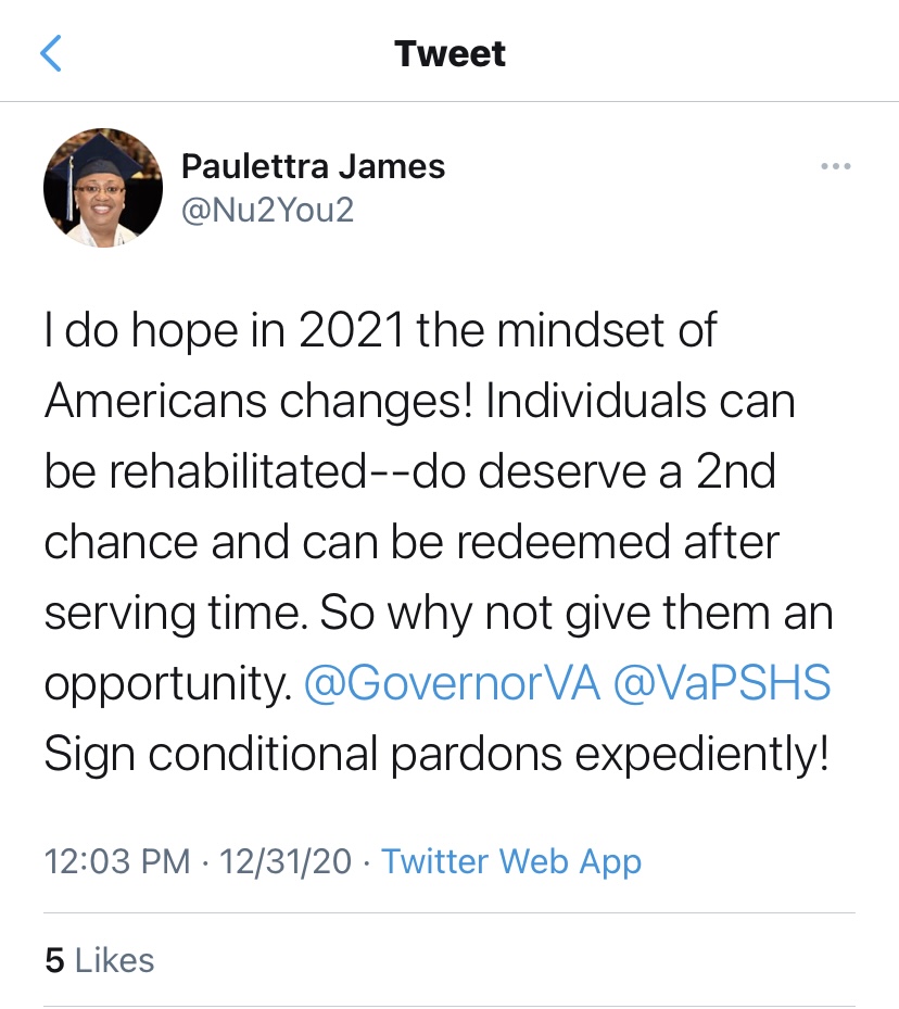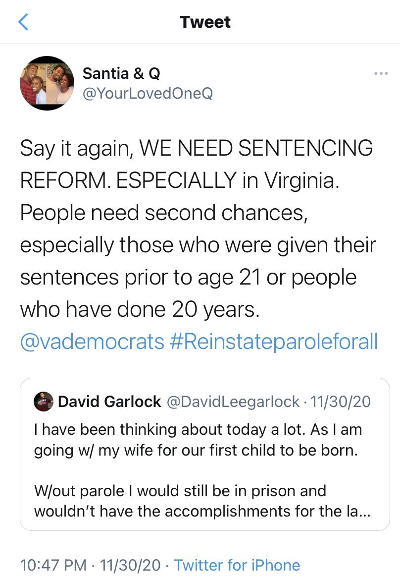 Currently focused in Virginia, we started our efforts with the goal achieving the release of our loved ones, Quadaire Patterson, Jerry James and Sincere Allah (who was released in 2022). As we’ve walked on this journey, we’ve become motivated to help others through humanization and criminal justice reform by bringing back fairness and equality to those who are currently behind bars, and have been for far too long.